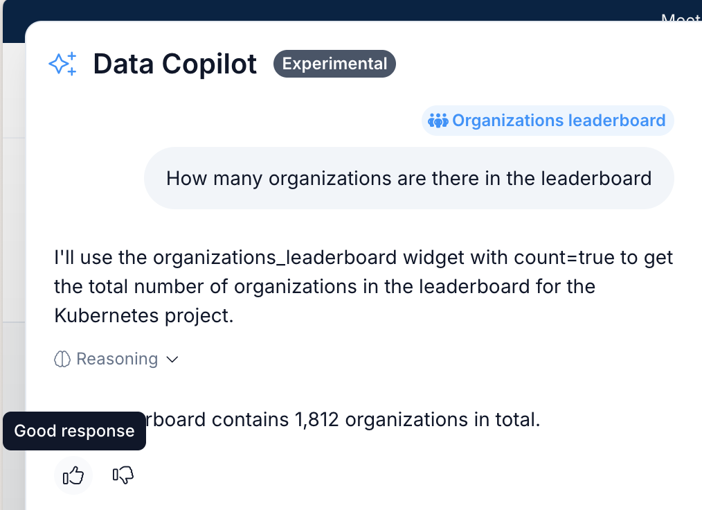 Your feedback is crucial for improving the LFX Data Copilot. Since this is an experimental feature, we're actively collecting user input to enhance functionality and user experience.